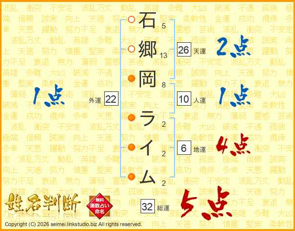 石(5画)郷(13画)岡(8画) ラ(2画)イ(2画)ム(2画)