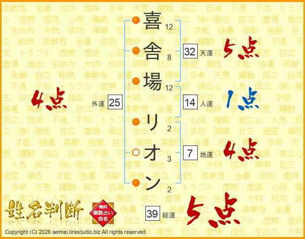 喜舎場リオンさんの総運は39画の5点!
