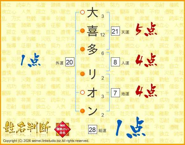 大(3画)喜(12画)多(6画) リ(2画)オ(3画)ン(2画)