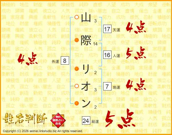 山(3画)際(14画) リ(2画)オ(3画)ン(2画)