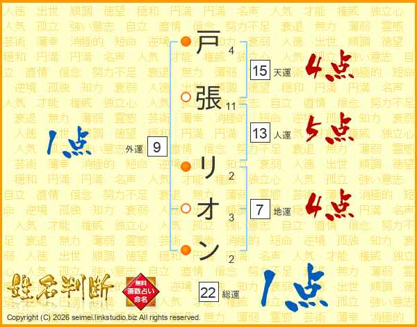 戸(4画)張(11画) リ(2画)オ(3画)ン(2画)