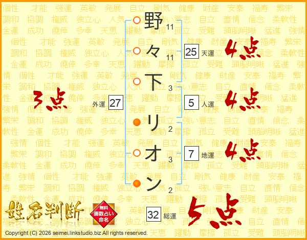 生活面を象徴する運勢です。外部から受ける影響力を表し、結婚運、家庭運や職場、環境への順応性を表します。総運から人運を引いた画数。姓や名が1文字の場合を除く。