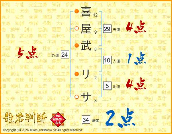 喜(12画)屋(9画)武(8画) リ(2画)サ(3画)
