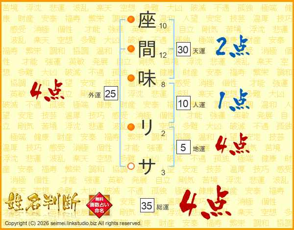 座間味リサさんの天運は30画の2点!