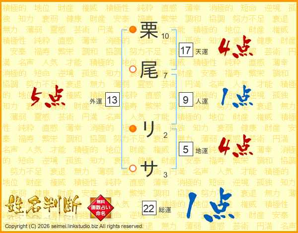 生活面を象徴する運勢です。外部から受ける影響力を表し、結婚運、家庭運や職場、環境への順応性を表します。総運から人運を引いた画数。姓や名が1文字の場合を除く。