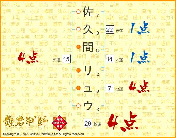 佐(7画)久(3画)間(12画) リ(2画)ュ(2画)ウ(3画)