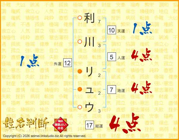 利川リュウさんの総運は17画の4点!