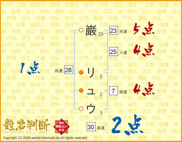 巌(23画) リ(2画)ュ(2画)ウ(3画)