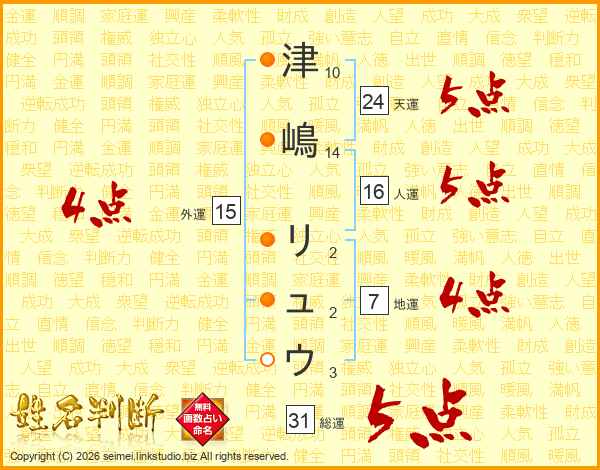 津嶋リュウさんの総運は31画の5点!