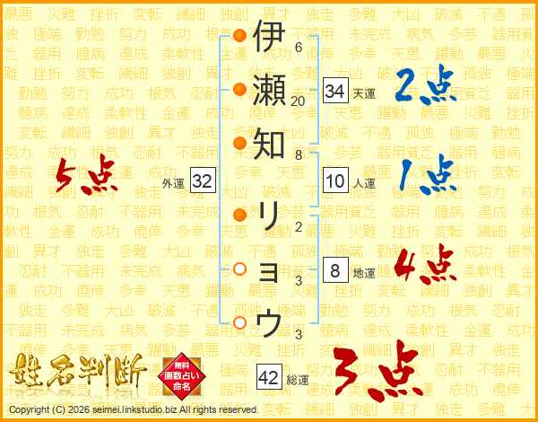 伊瀬知リョウさんの総運は42画の3点!