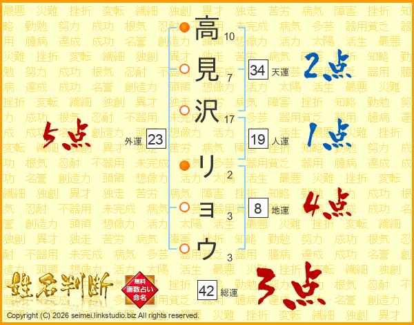 高(10画)見(7画)沢(17画) リ(2画)ョ(3画)ウ(3画)