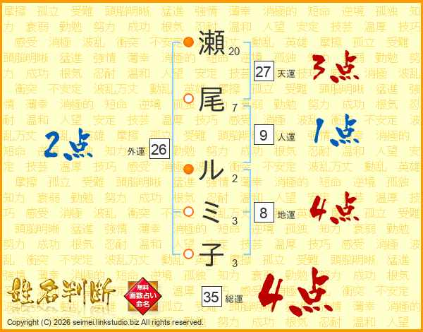 瀬尾ルミ子さんの総運は35画の4点!