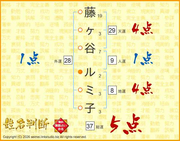 藤ヶ谷ルミ子さんの総運は37画の5点!