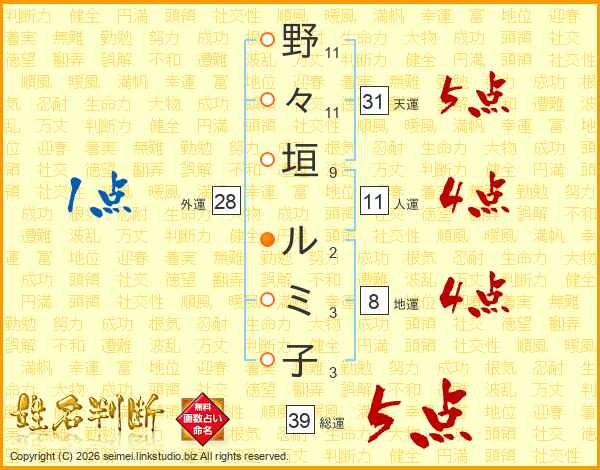 野々垣ルミ子さんの総運は39画の5点!