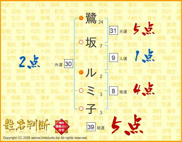 鷺(24画)坂(7画) ル(2画)ミ(3画)子(3画)