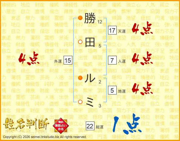 勝(12画)田(5画) ル(2画)ミ(3画)