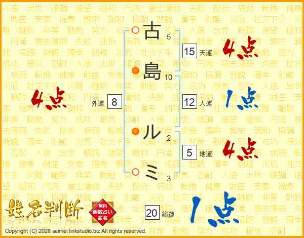 古(5画)島(10画) ル(2画)ミ(3画)