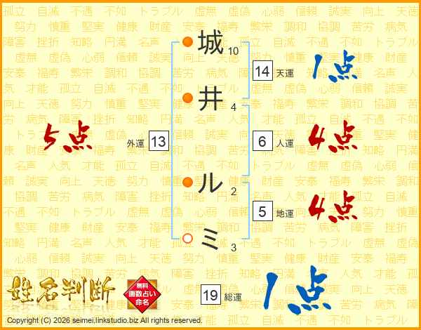 生活面を象徴する運勢です。外部から受ける影響力を表し、結婚運、家庭運や職場、環境への順応性を表します。総運から人運を引いた画数。姓や名が1文字の場合を除く。