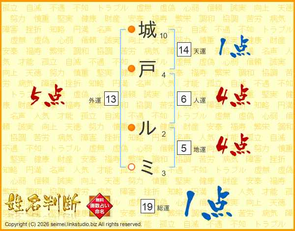 城(10画)戸(4画) ル(2画)ミ(3画)