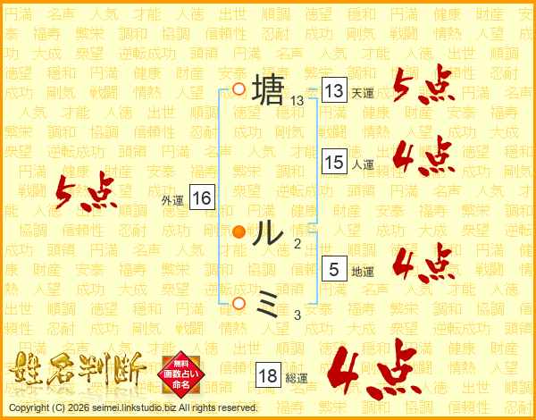 生活面を象徴する運勢です。外部から受ける影響力を表し、結婚運、家庭運や職場、環境への順応性を表します。総運から人運を引いた画数。姓や名が1文字の場合を除く。