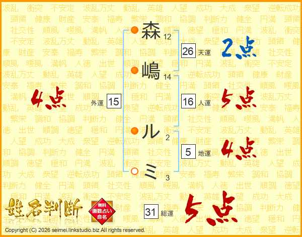 森(12画)嶋(14画) ル(2画)ミ(3画)