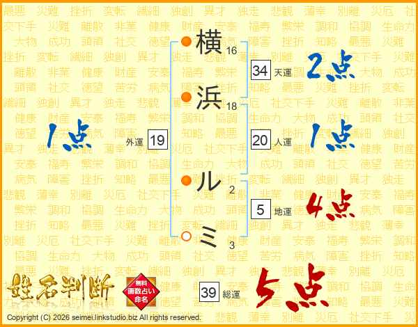 横(16画)浜(18画) ル(2画)ミ(3画)