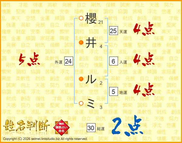 櫻(21画)井(4画) ル(2画)ミ(3画)
