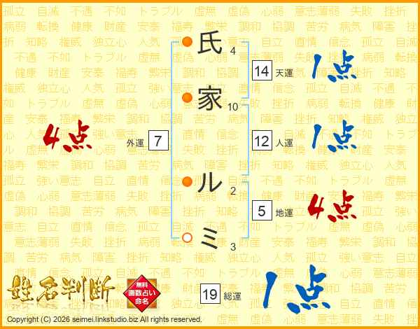 氏(4画)家(10画) ル(2画)ミ(3画)