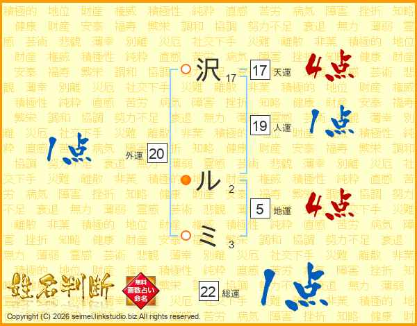 生活面を象徴する運勢です。外部から受ける影響力を表し、結婚運、家庭運や職場、環境への順応性を表します。総運から人運を引いた画数。姓や名が1文字の場合を除く。