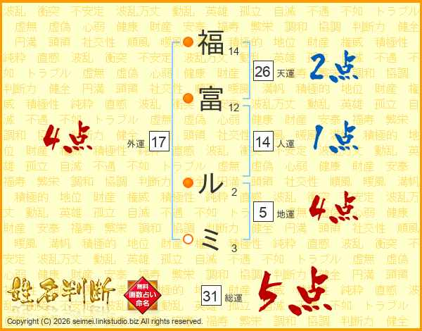 福(14画)富(12画) ル(2画)ミ(3画)