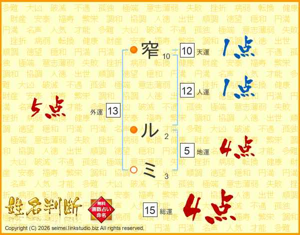 窄ルミさんの総運は15画の4点!