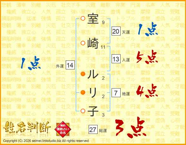 生活面を象徴する運勢です。外部から受ける影響力を表し、結婚運、家庭運や職場、環境への順応性を表します。総運から人運を引いた画数。姓や名が1文字の場合を除く。