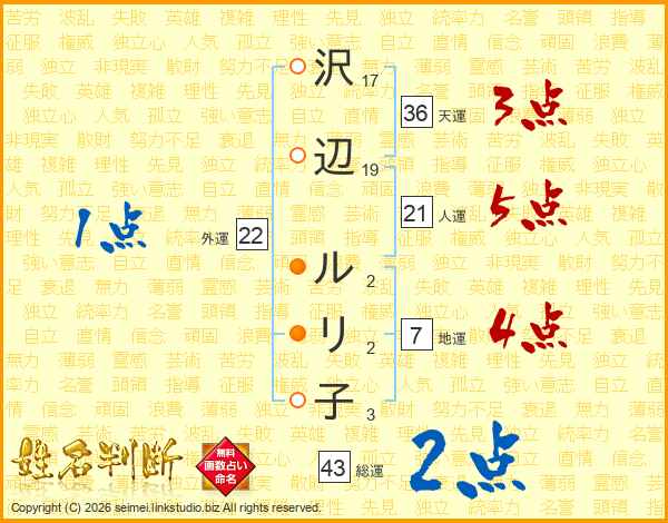 沢辺ルリ子さんの人運は21画の5点!