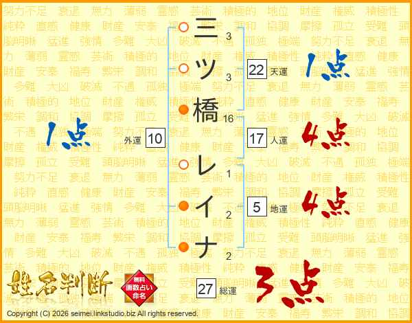 生活面を象徴する運勢です。外部から受ける影響力を表し、結婚運、家庭運や職場、環境への順応性を表します。総運から人運を引いた画数。姓や名が1文字の場合を除く。
