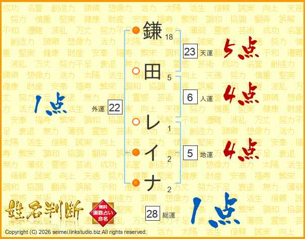 生活面を象徴する運勢です。外部から受ける影響力を表し、結婚運、家庭運や職場、環境への順応性を表します。総運から人運を引いた画数。姓や名が1文字の場合を除く。