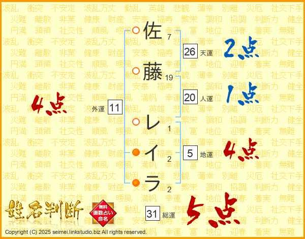 佐藤レイラさんの総運は31画の5点!