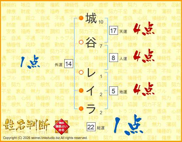 城谷レイラさんの総運は22画の1点!