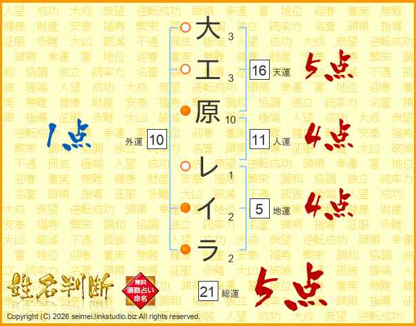 大工原レイラさんの総運は21画の5点!