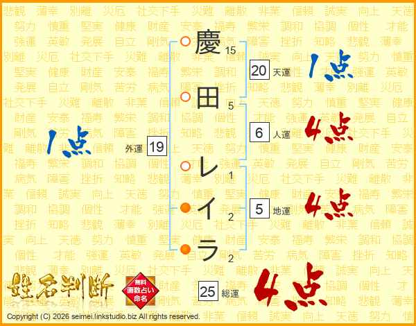 慶(15画)田(5画) レ(1画)イ(2画)ラ(2画)