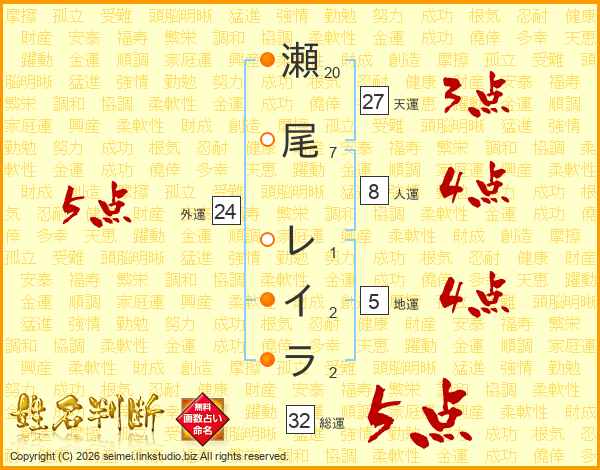 瀬(20画)尾(7画) レ(1画)イ(2画)ラ(2画)
