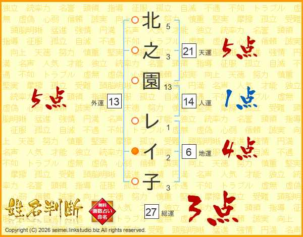 生活面を象徴する運勢です。外部から受ける影響力を表し、結婚運、家庭運や職場、環境への順応性を表します。総運から人運を引いた画数。姓や名が1文字の場合を除く。