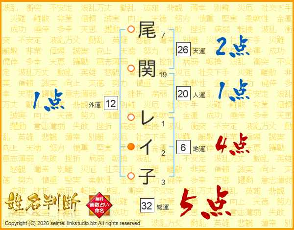 尾(7画)関(19画) レ(1画)イ(2画)子(3画)