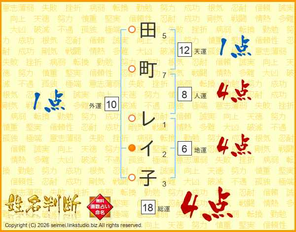 田町レイ子さんの総運は18画の4点!