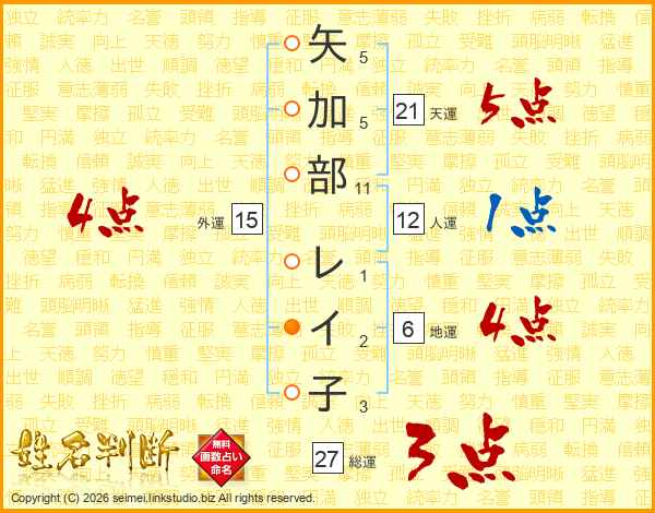 矢(5画)加(5画)部(11画) レ(1画)イ(2画)子(3画)