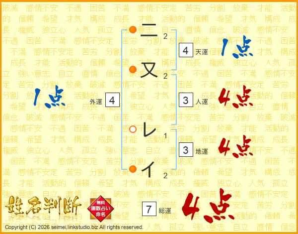 生活面を象徴する運勢です。外部から受ける影響力を表し、結婚運、家庭運や職場、環境への順応性を表します。総運から人運を引いた画数。姓や名が1文字の場合を除く。