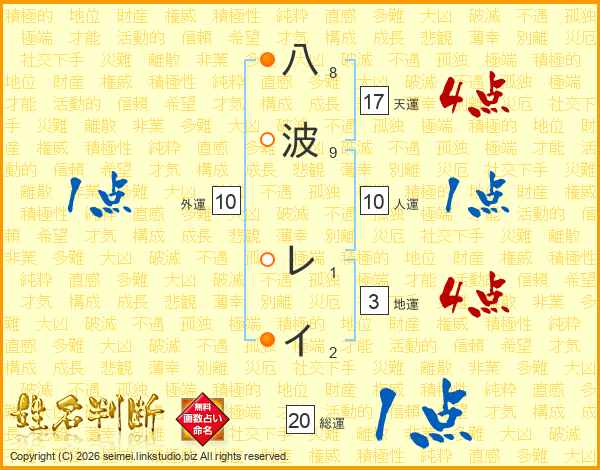 生活面を象徴する運勢です。外部から受ける影響力を表し、結婚運、家庭運や職場、環境への順応性を表します。総運から人運を引いた画数。姓や名が1文字の場合を除く。