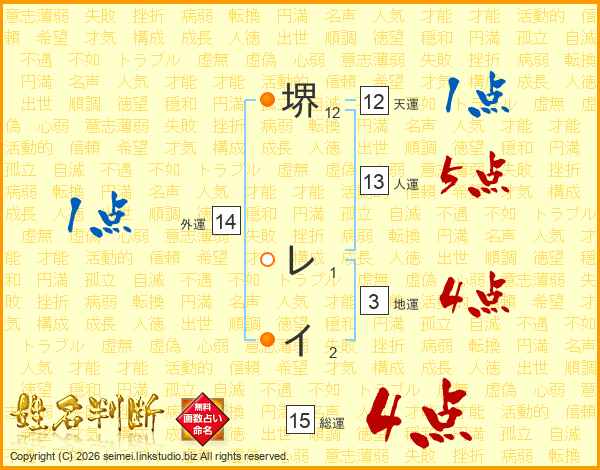 生活面を象徴する運勢です。外部から受ける影響力を表し、結婚運、家庭運や職場、環境への順応性を表します。総運から人運を引いた画数。姓や名が1文字の場合を除く。