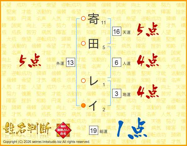 生活面を象徴する運勢です。外部から受ける影響力を表し、結婚運、家庭運や職場、環境への順応性を表します。総運から人運を引いた画数。姓や名が1文字の場合を除く。