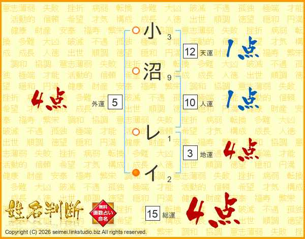 小沼レイさんの総運は15画の4点!