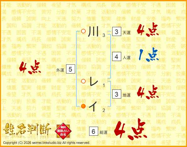 生活面を象徴する運勢です。外部から受ける影響力を表し、結婚運、家庭運や職場、環境への順応性を表します。総運から人運を引いた画数。姓や名が1文字の場合を除く。